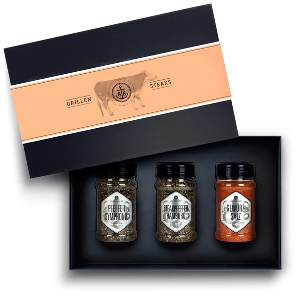 Eine Kunst die jeder beherrschen möchte: Das perfekte Steak grillen. Zum Learning by Doing oder zum Optimieren der bereits vorhandenen Künste gibt es von Ankerkraut das Geschenkset „Steaks Grillen“ mit den 3 wichtigsten Gewürzen im Streuer, die danach schreien dem perfekt gegrillten Steak das gewisse Etwas zu verpassen. Das Set wird sogar fertig eingepackt geliefert, so dass man nur noch drauf los schenken muss. Es kommt in einem festen Karton, der mit edlem schwarzen Papier bezogen ist. Den letzten Schliff bekommt das Geschenkset durch eine Banderole.Art.-Nr.: 1546968