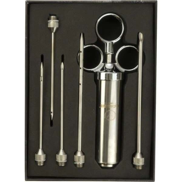 Die BBQ-Spritze No.1, Edelstahl-Bratenspritze von Moesta-BBQ ist eine Marinadenspritze, entwickelt um dem passionierten Griller das perfekte Tool an die Hand zu geben, um sein Fleisch von innen zu würzen. Ob Pulled Pork, Beef Brisket oder auch kleine Fleischstücke wie Schweinefilet, Hühnerbrust ode Fisch können jetzt mit einer Injektion versehen werden. Eine Injektionsspritze wird verwendet, um Grillfleisch oder andere Lebensmittel von innen zu würzen. Auch beim Pökeln ist eine Spritze sinnvoll. Gerade bei großen Fleischstücken und Braten kann es vorkommen, dass sie trocken werden, wenn man mit der Kerntemperatur zu hoch geht. Daher gehört diese Spritze in jedes gute Grill-Equipment. Hier hat man alles was man braucht in einer hochwertigen Box, und nichts fliegt lose umher. Alle Nadeln haben unterschiedliche Auslässe an den Spitzen für unterschiedliche Einsatzzwecke: 1 Nadel 15cm lang / 5mm Durchmesser mit 12 seitlich angebrachten Löchern (4 Reihen zu je 3 Löchern), 1 Nadel 15cm lang / 5mm Durchmesser mit abgeschrägtem Auslass an der Spitze, Zusatznadel A: 11cm lang / 2,8mm Durchmesser mit abgeschrägtem Auslass an der Spitze, Zusatznadel B: 11cm lang / 2,8mm Durchmesser mit 2 seitlich runden Löchern, Zusatznadel C: 11cm lang / 2,8mm Durchmesser mit 2 seitlich versetzten Lang-Löchern, dazu gibt es 2 Silikon-Ersatzdichtungen für den Kolben, 2 Silikon-Ersatzdichtungen für die Nadeln und eine Bedienungsanleitung mit Rezepten. Alle Teile, die mit Fleisch oder Marinade in Berührung kommen, sind aus Edelstahl 304 / 1.4301 / V2A gefertigt.Art.-Nr.: 1516020