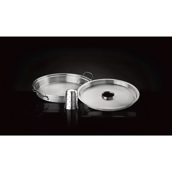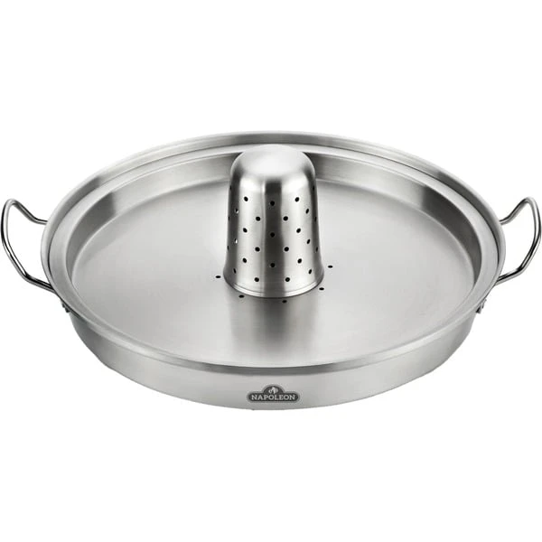 Die 3 in1 Premium Hähnchen-Halterung 56067 von Napoleon besteht aus drei einfach abzunehmenden Edelstahl-Teilen. Die Anwendung ist denkbar leicht: Flüssigkeit in die untere Pfanne gießen, den Deckel einlegen (darauf kann Gemüse gegart werden) und anschließend den Hähnchenhalter einsetzen und das Hähnchen darauf platzieren. Das durchdachte Grillwerkzeug sorgt für ein hervorragendes Aroma. Man kann auch der Kreativität freien Lauf lassen und verschiedene andere Säfte, Weine oder sonstige Flüssigkeiten ausprobieren. Die Premium Hähnchen-Halterung ist selbstverständlich spülmaschinenfest.Art.-Nr.: 1872856