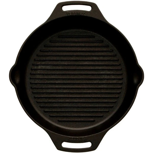Die gusseiserne Petromax Grill-Feuerpfanne gp30h gehört mit ihrer exzellenten Wärmespeicherung zur Ausstattung jeder Küche. Sie ist für das Zubereiten von Fleisch, Gemüse und Co. mit dem besonderen Grillaroma ideal, da sich die Hitze in Gusseisen gleichmäßig verteilt und lange gespeichert wird. Die Rillen am Pfannenboden geben dem Bratgut nicht nur das typische Grillmuster, sondern ermöglichen auch besonders fettarmes und gesundes Braten. Ob in der Draußen-Küche über dem offenen Feuer gekocht wird oder auf dem Herd zuhause, man kann die Feuerpfanne sowohl auf herkömmlichen Herdplatten, auf Gasflammen, im Backofen als auch im Freien auf einer Kochstelle, über einem Lagerfeuer oder auf einem passenden Grill verwenden. Das Gusseisen mit seiner ausgezeichneten Wärmeverteilung und -speicherung ist dank der vorbehandelten Oberfläche (seasoned finish) sofort einsatzbereit und leicht zu pflegen.Art.-Nr.: 1532912