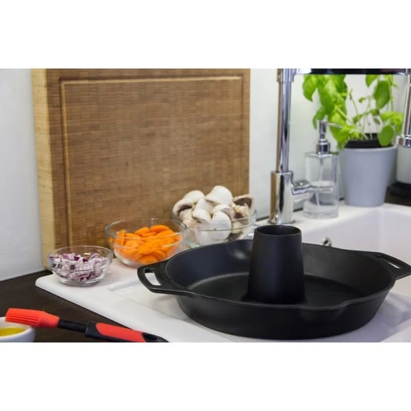 Mit dem Geflügelbräter cf30 von Petromax kann man Hähnchen, Wachteln oder eine kleine Ente ohne großen Aufwand zubereiten. Auf dem gusseisernen Bräter sitzend, wird das Geflügel durch die optimale Hitzeverteilung gleichmäßig saftig gegart. Während das Fleisch im Ofen oder auf dem Grill brutzelt, fließen überschüssiges Fett und Bratensaft in die Auffangschale. So bekommt das Geflügel von außen eine leckere, krosse Haut und von innen sorgt die mit Gewürzen, Kräutern oder Brühe gefüllte Vertiefung für das richtige Aroma. Die wertvollen Eigenschaften des Materials, wie die vorbehandelte Oberfläche (seasoned finish) und die natürliche Antihaftwirkung, runden die leichte Handhabung des Gussbräters ab.Art.-Nr.: 1533736